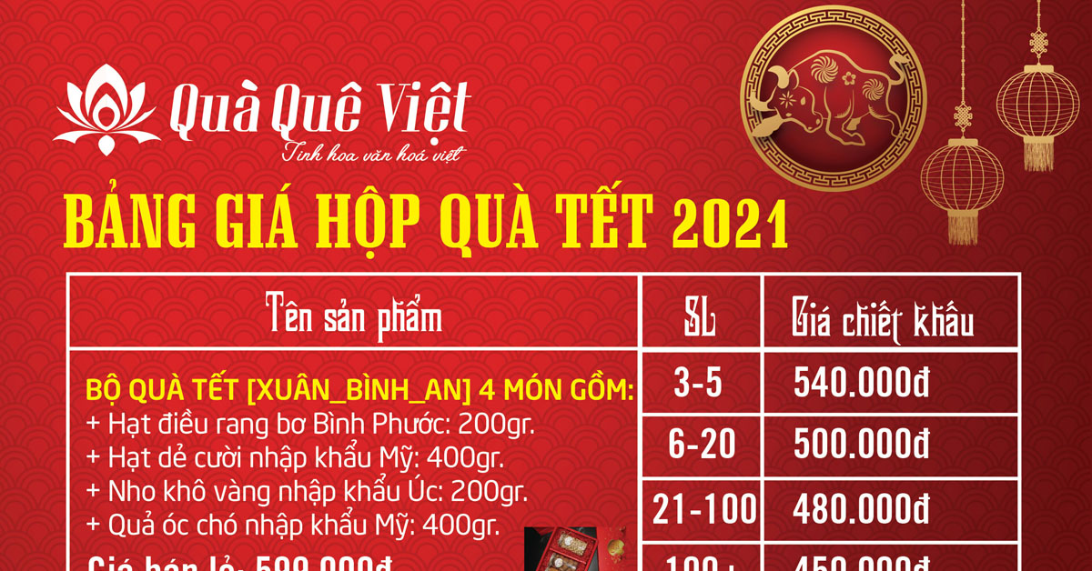 Bảng giá quà tết 2021, bảng giá đại lý, giá sỉ hộp quà tết 2021 cung cấp bởi Quà Quê Việt, mẫu mã sản phẩm đa dạng chiết khấu cao cho đại lý và cộng tác viên có nhu cầu nhập quà tết 2021 tại Quà Quê Việt.