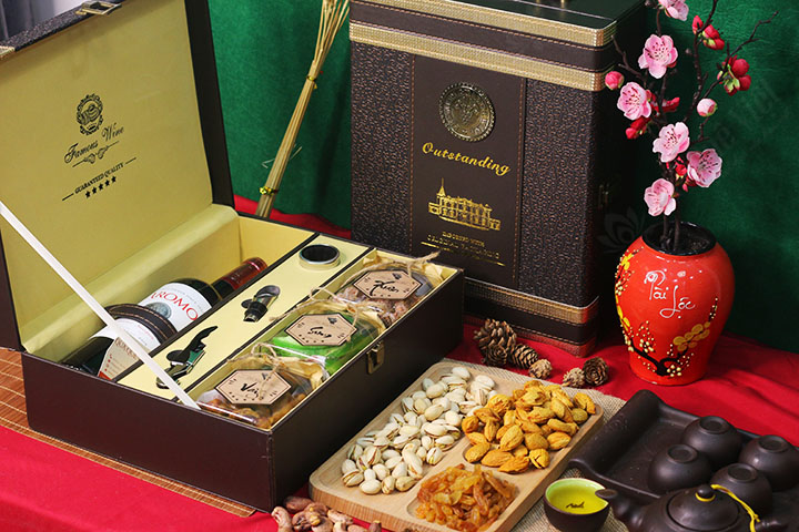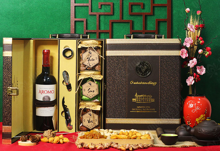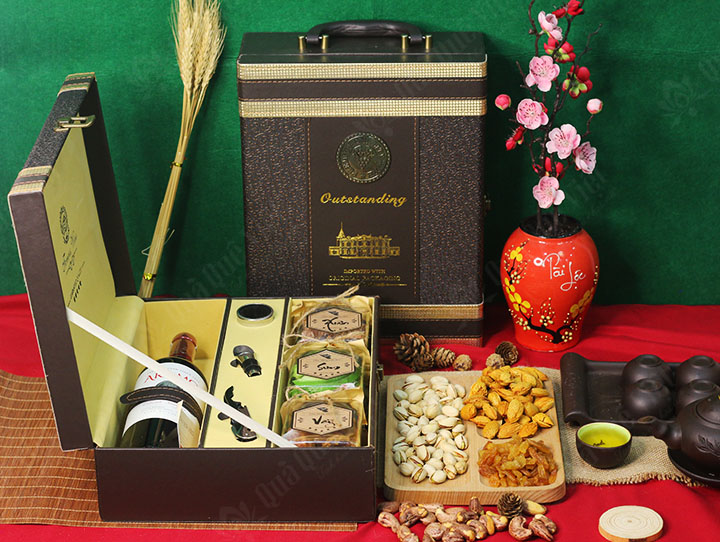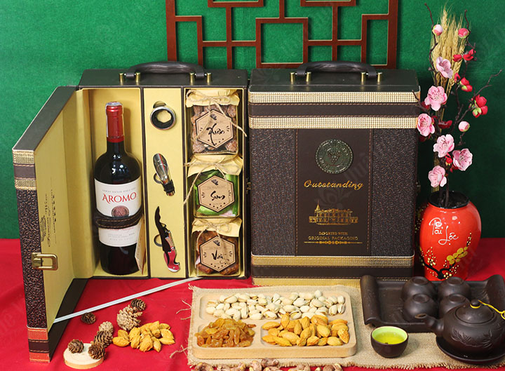 Mẫu hộp quà tết bằng da đang là xu thuế quà tặng tết năm 2026 đây là mẫu hộp quà vừa đơn giản vừa sang trọng được thiết kế như một vali tiện lợi. Thành phần bên trong hộp quà là sự kết hợp giữa phần thức uống tuỳ chọn gồm 1 chai vang nhập khẩu và 3 loại hạt hoặc thực phẩm đi kèm giúp món quà trở nên trọn vẹn hơn. Đây sẽ là món quà ý nghĩa để dành tặng bạn bè, người thân, đồng nghiệp, sếp cty trong dịp tết đến xuân về sắp tới.