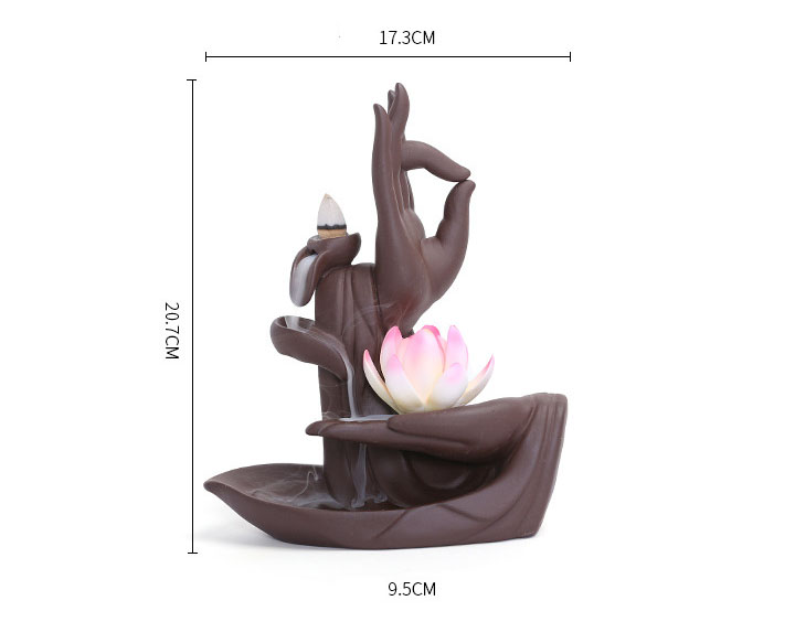 Bàn Tay Phật bắt ấn và một bàn tay còn lại nâng đóa hoa sen. Trên tay áo của bàn tay bắt ấn được thiết kế làm nơi để đốt trầm hương, theo đó làn khói trắng mờ sẽ chảy dọc xuống và tạo thành một ao sương trắng vô cùng huyền dịu. Chất liệu được làm từ cát tím cao cấp và là hàng thủ công mang đậm nét đẹp tinh tế của người nghệ sĩ.