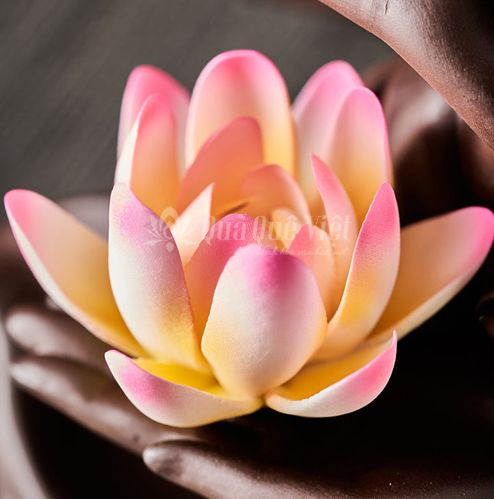 Bàn Tay Phật bắt ấn và một bàn tay còn lại nâng đóa hoa sen. Trên tay áo của bàn tay bắt ấn được thiết kế làm nơi để đốt trầm hương, theo đó làn khói trắng mờ sẽ chảy dọc xuống và tạo thành một ao sương trắng vô cùng huyền dịu. Chất liệu được làm từ cát tìm cao cấp và là hàng thủ công mang đậm nét đẹp tinh tế của người nghệ sĩ.
